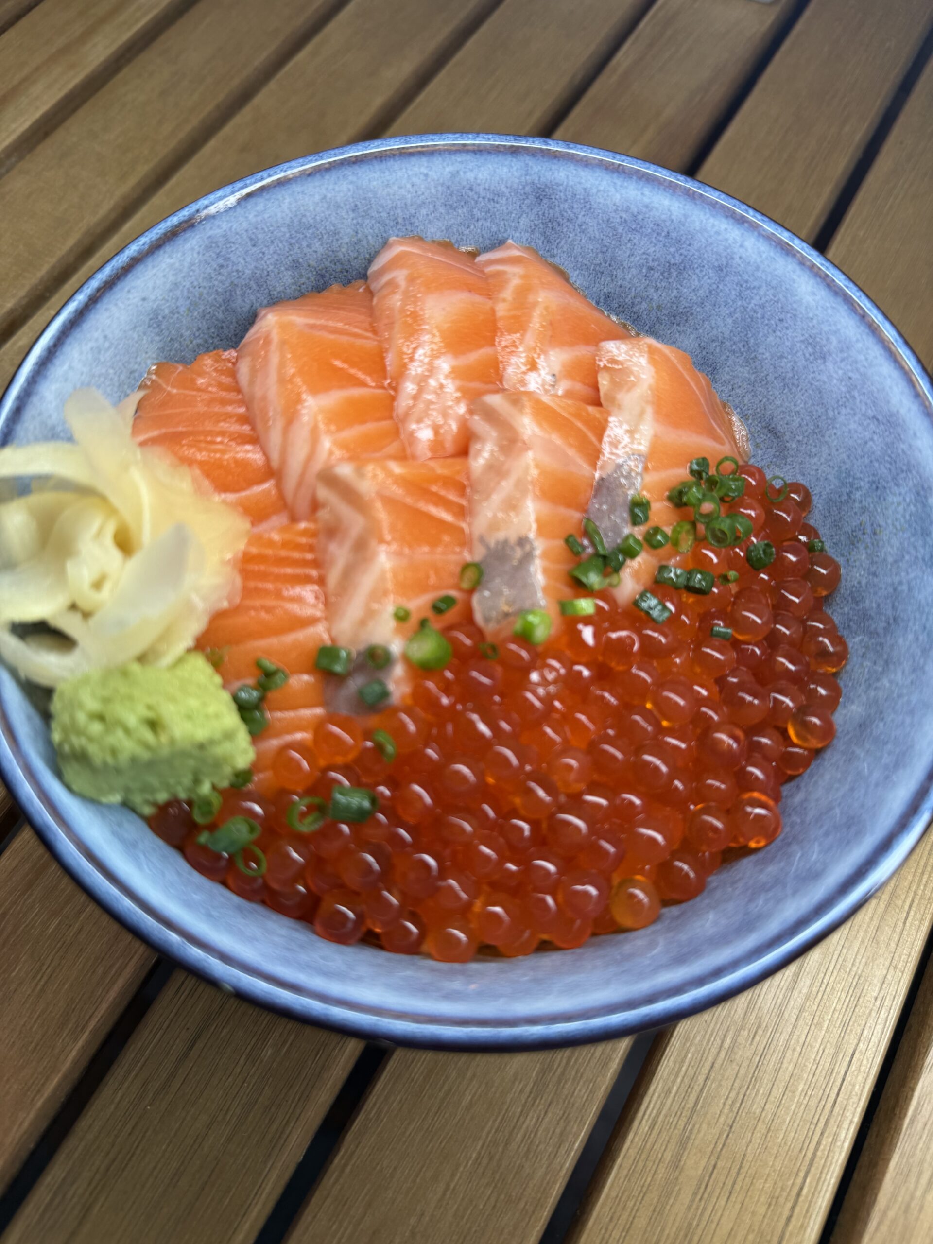 Sushi Rice, Raw Salmon & Roe, Garnish, Soy Sauce, wasabi, pickled ginger